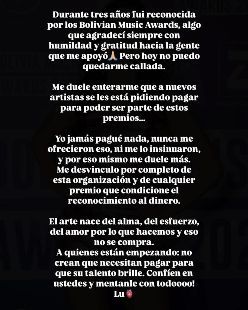 A estas voces se sumó la cantante Lu de la Tower, quien en años anteriores fue reconocida por la misma organización. “Me duele enterarme que a nuevos artistas se les está pidiendo pagar para poder ser parte de estos premios… Yo jamás pagué nada”, escribió, y anunció su desvinculación total del evento. “El arte nace del alma y del esfuerzo… eso no se compra”.