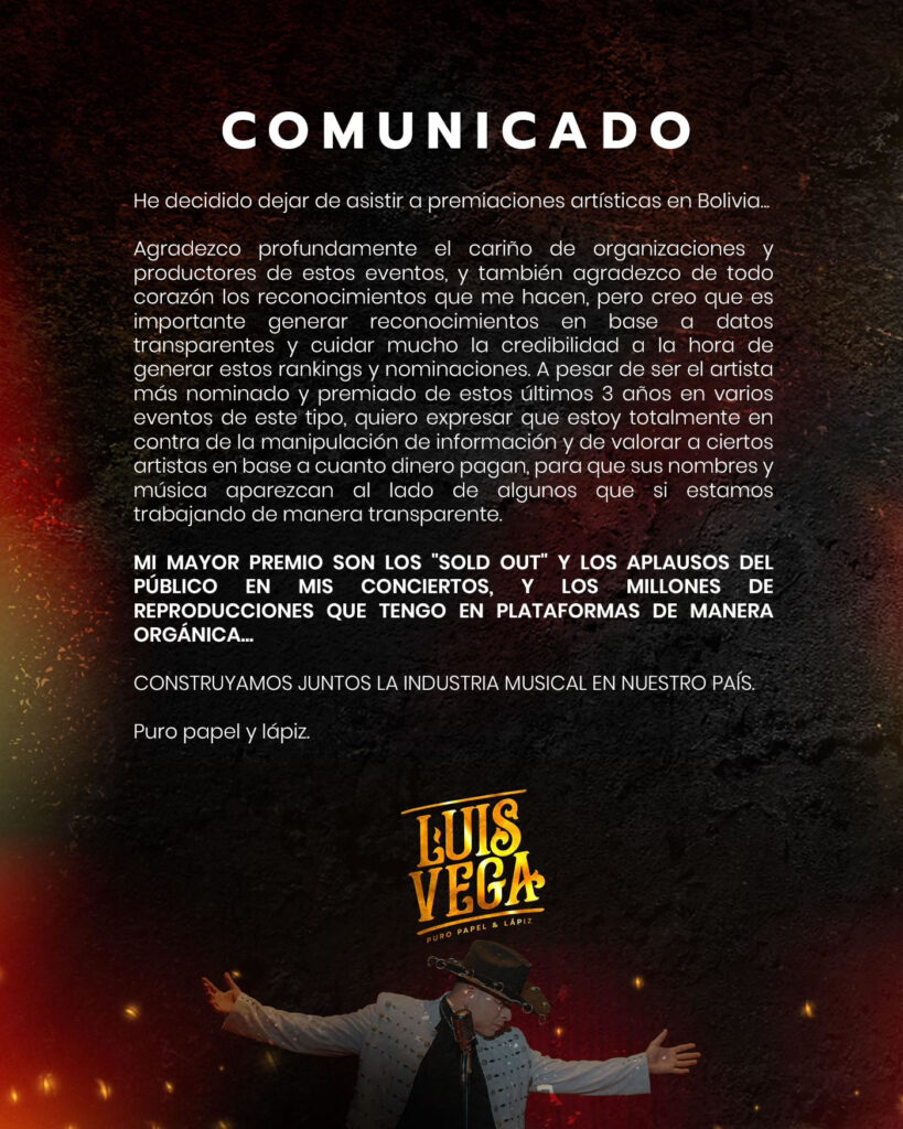 La declaración de Drop-D provocó una ola de reacciones. El reconocido artista Luis Vega, uno de los más premiados en ediciones anteriores, también se pronunció al respecto, anunciando que dejará de asistir a premiaciones en Bolivia. En un comunicado publicado en sus redes sociales, expresó: “Estoy totalmente en contra de la manipulación de información y de valorar a ciertos artistas en base a cuánto dinero pagan”.