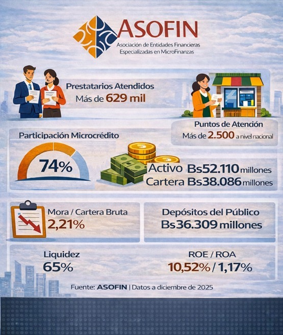 La Paz, enero de 2026. Al cierre de diciembrede2025, las entidades asociadas a ASOFIN consolidaron resultados que reflejan la resiliencia del modelo de las microfinanzas en un contexto de desafíos sociales, políticos y macroeconómicos, así como presiones vinculadas a la volatilidad del tipo de cambio. Con una atención que supera los 629.000 prestatarios, presencia urbana y rural y una red de más de 2.500 puntos de atención financiera a nivel nacional, ASOFIN ratificó su aporte a la inclusión financiera y al desarrollo de la micro y pequeña actividad económica.